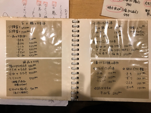 生の三種盛り合わせ、焼き物は当日限定の、モモ、ヒップ、せせり、などなど、