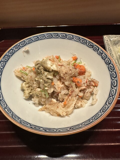 ご飯の出し方に変更があったのか、先に鴨のそぼろご飯と香箱蟹、後から白ごはんにからすみかけたからすみご飯と卵かけご飯でご飯ものがフィニッシュ。