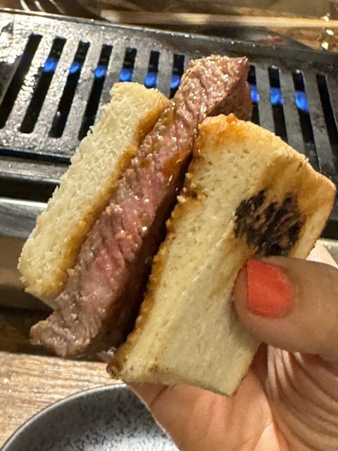 部位はシンシンこちらも目の前でお店の方が焼いてくださって、パンも軽く温めてなおしてデミグラスソースを塗ってパンに挟んでカット。