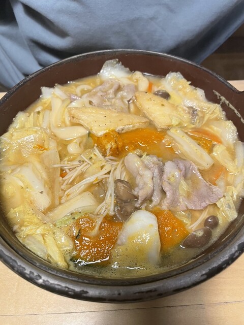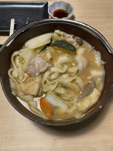 働いてる人も来てる人もほとんど外国の人でした、このほうとうは麺が美味しくて煮込んでるほうとうにしては形がしっかり残っていて食べやすかったです。麺と絡んでスープもかぼちゃ感がそこまで強くなくバランスがよかったです