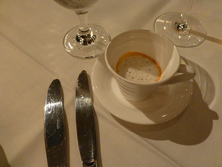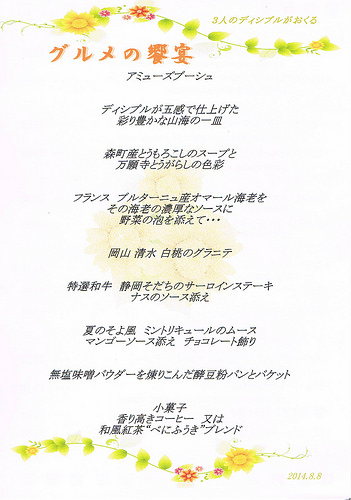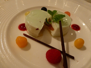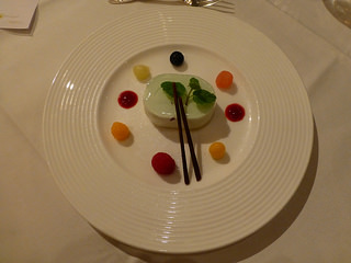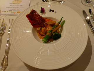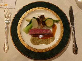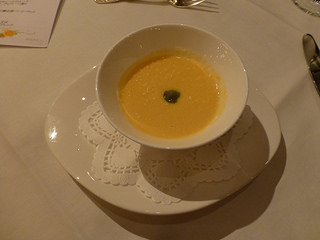 久しぶりにエトワールででディナーをいただいた。メニュー前菜はホワイトアスパラ、ウニのムース、サーモンのミルフィーユとあと・・・何だったか忘れた。右はコーンポタージュスープで森町の甘太郎を使用したもの。見た目からは想像できないくらいとても甘い。味噌粉を練りこんだパン今回のために試行錯誤で作ったとの事。定番メニューではなく、また食べられないのが残念クイーン・オブ・ブルー高級茶葉を低温抽出したお茶で、高いんだけどすごく香りが良い。また飲んでみたいオマールエビに右の海老ソースをかけて食べる。海老ソースが濃厚で美味しい。海老が亡くなった後も、パンでソースをすくっていただいた。口直しのシャーベットとして白桃のシャーベット白桃の味がしっかりしていて香りも良く美味しいA5ランクサーロインステーキなだけあって、脂身がしつこくなく、美味しい。ミントの味が控えめにしてあり、中のマンゴーの味を消していなかった。このバランスはなかなか難しいのだろうなと感じた。べにふうき(紅茶)クイーン・オブ・ブルーが素晴らしくて残念ながらバラの形のフィナンシェ&マカロンフィナンシェは身が詰まっていて味も濃厚。マカロンは白(バナナ)、茶(チョコレート)でお茶請けとしていただいた。全体としては完成度は高い。たまに贅沢するのなら良いところだと思う。