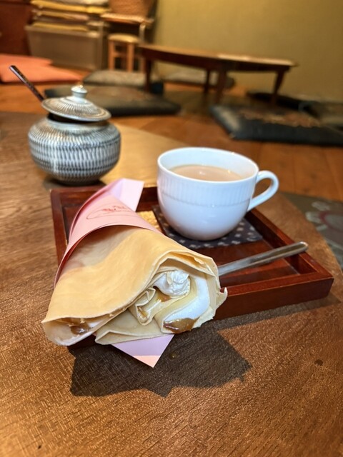 息子がクレープを食べてみたいと言ったので、ちょうどお出かけ先の近くにあった囲茂庵さんに寄せてもらいました。お店の方が優しく声をかけてくださり、古民家のお部屋で畳丸テーブルに座布団という最高にリラックスできる環境でおいしいクレープと温かいチャイをよばれました。