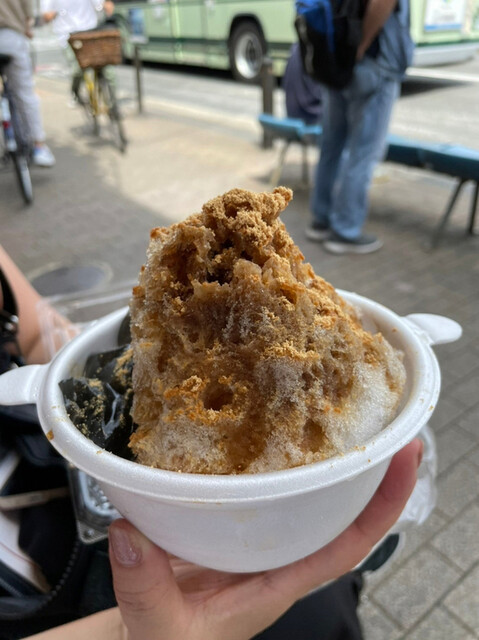 かき氷はわらび餅が入っていて、きな粉と黒蜜がかかっています。今まで食べた中で1番美味しかった。