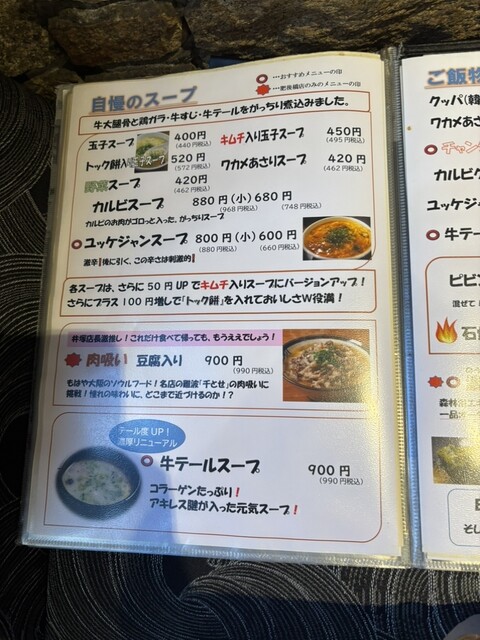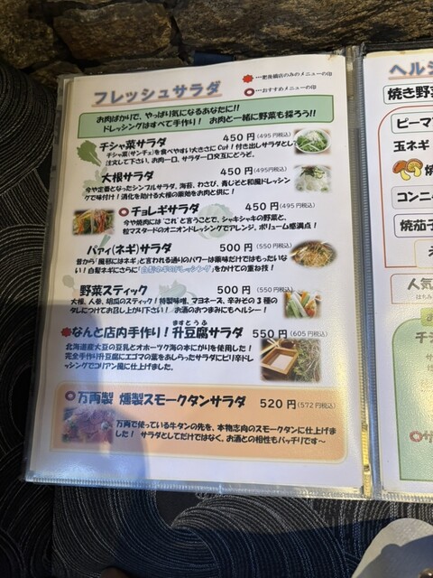 生センマイ、厚切り塩タン、塩ロース、上ハラミ、中落ちカルビ、ホルモン3種、ザブトン、キムチ3種盛り、ご飯大、焼き野菜盛り合わせ、焼きニンニクのオーダーで、2人で1万ちょいでした。