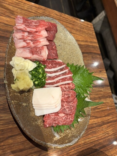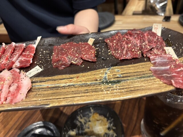 突き出しははりはり鍋スープ。めっちゃうまい。ユッケ、ポテサラ、刺身5種盛り合わせ、焼肉5種盛り合わせ、ローストホース、追加でヒレ肉、うまたく巻、サービスで味噌汁、抹茶アイスで17000円ほどでした。