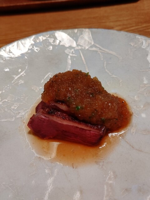 真鴨、その上には玉ねぎソースにセリの胡麻和え
