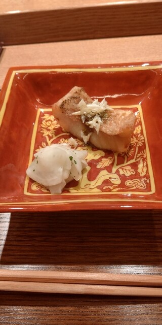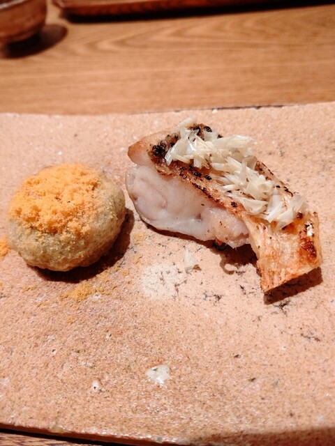 塩味がすこし強いマツカサウオとその鱗(鱗には味が殆ど無く強めの塩気にした訳に納得)隣にはそら豆餠