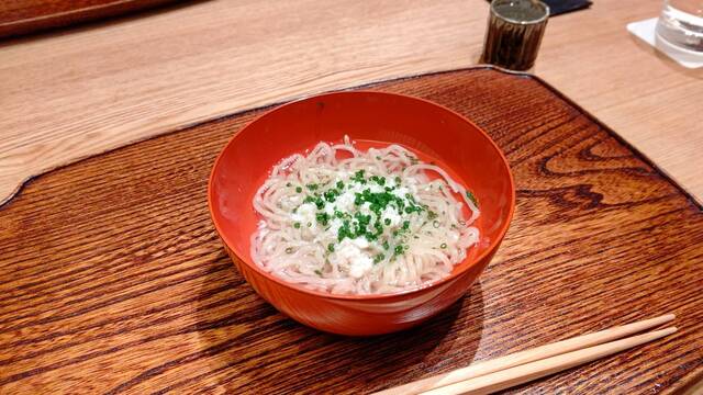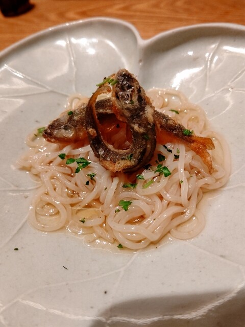 虎白麺と稚鮎揚げ物、鮎の苦味か実に美味