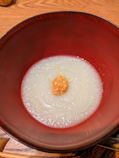 とらふぐとアン肝のペースト、その上に秘伝の橙のジュレ