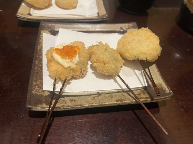この日に食した串揚げは写真の注釈に記載していますがどれも大変美味しかった、、特にトウモロコシ、生麩、烏賊が絶品でしたね。。