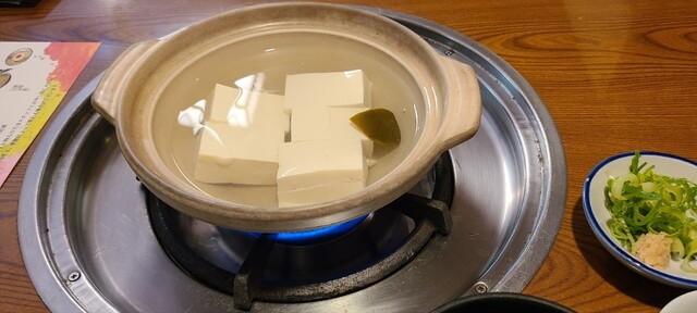 ガスが点火され湯豆腐の入った鍋がかけられます、つゆと薬味の刻み葱と生姜が付きます。