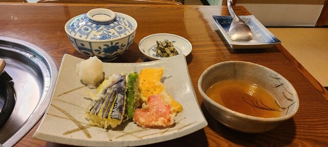 茄子、南瓜、たまねぎ、ししとう、紅生姜の内容。大根おろしもたっぷり、薄味の天つゆ。