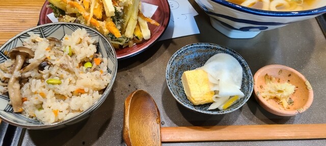 かき揚げは筒状に高く仕上げられ衣も薄く軽くサックリ(具材のさつまいもが際立ってました)、かやくご飯もきのこや枝豆も見え隠れし、小鉢は