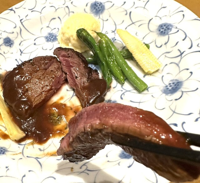 夕凪7000円のコースを注文。ワインのペアリング3グラスをプラスしたので10000円超となったが、肉柔〜旨し!ミディアムを擦りたて山葵で食す!最高でした。