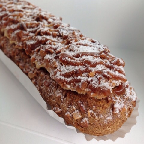「キャラメルであえたピスタチオとクルミのカリカリ感、滑らかなキャラメルクリームのエクレア」との事。