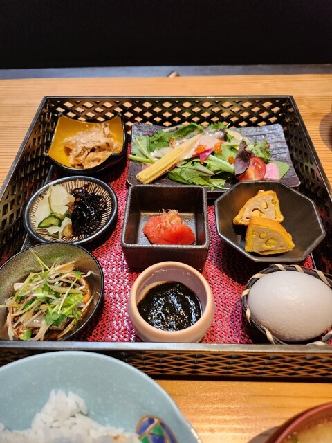 カウンターに座ると係の方がお茶やお冷や、豚汁を運んでこられます。ごはんは自分で好きなだけお茶碗によそいます。足りなければごはんを足して頂けます。炭で焼いた鮭や卵かけご飯の生卵だけで、ごはん足りないの確定です。おかずもいろんな種類が少しずつあって嬉しいです