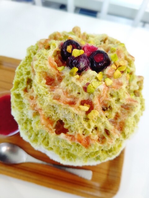 ちょこんと鎮座したブルーベリーが意外に甘く、別添えのベリーソースが酸味が弱めで味が濃厚で、円やかなピスタチオミルクと相まって、ははは、こりゃたまらん!