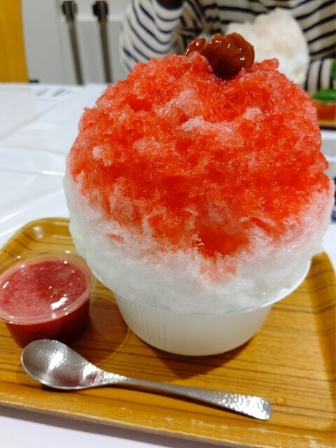 本来は練乳が付くスタイルですが、苺シロップにカスタマイズさせていただきました。