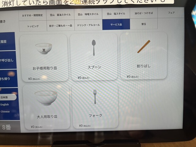 以前来た時はタッチパネルではなかったのですが全席タッチパネルになっていました。