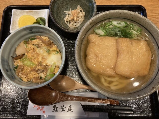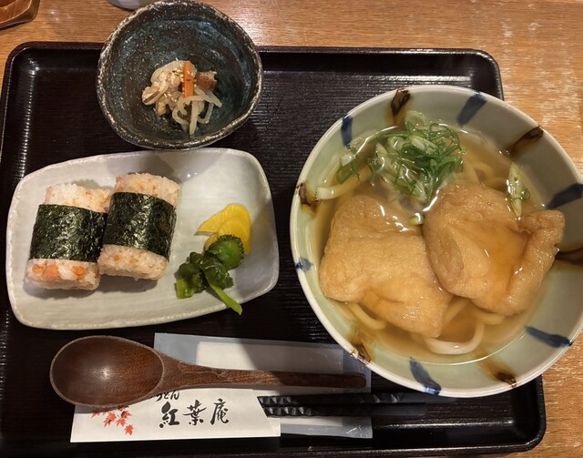 1番人気のきつねうどんと鮭おにぎりセットで。海苔がパリっとして好み。