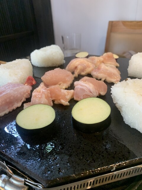 溶岩プレートの端でずっと焼いていたおにぎり