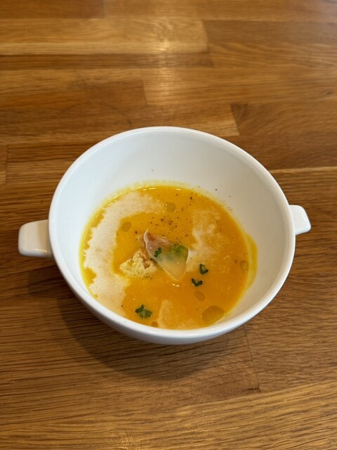 前菜のサバの自家製燻製、レバーペースト、カボチャのポタージュも繊細で上品なお味。