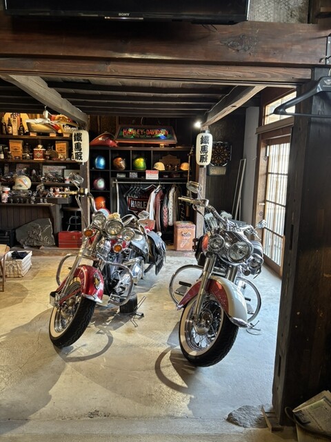 店内にハーレーが2台置いてあり、店内の小物もハーレーのもの。