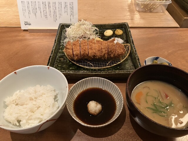 いやー、めっちゃうまかった!阪東もち豚という品種のロースカツ。肉に甘さがあってジューシーでめちゃくちゃうまかった。大根おろし入りウスターソース、塩、マヨネーズ、からしと調味料が豊富で味変も楽しめて最高やったな。ご飯は岐阜県産の龍の瞳という希少米らしく、もちもちで粒がしっかりしてて、確かにめっちゃうまかった。おかわりできるのもポイント高い。豚汁、和風カレー、福神漬けもそれぞれちゃんとめっちゃうまかった。すごい。とんかつ待ってる間に予想外にだし巻き玉子が出てきて、これもふわふわでめっちゃうまかった。最後はコーヒーゼリーで締め。ほのかに甘いふわふわミルクがさっぱりしたゼリーにめっちゃ合う。値段は相応にするがそれも含めて大満足。次は品切れしてた特リブロースかつ食いたい。