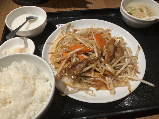特売ランチで豚レバーもやし炒め600円を注文。ご飯、スープ、漬物、杏仁豆腐が付いてこの料金は破格。