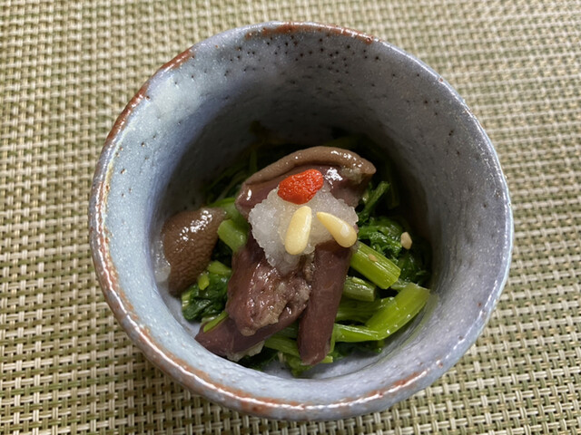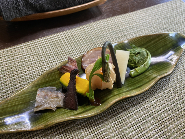 〜鯉の煮付と卵、どじょう、熊出汁で炊いた大根、猪のハム、きのこ等
