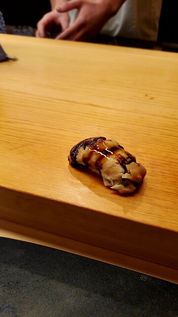 大将いわく、この時期のいくらは、まだ産卵前、初期の状態でいくらの皮がものすごく柔らかい。そのため、口に入れたときに、まったく弾けず、ただただ濃厚ないくらの味が、するっとシャリに絡みつき、ノリの風味と混ざるのが良いとのこと。いくらってプチっと弾けるのが良いとか聞きますが、まったく逆ベクトルをいく楽しみ方。確かにいい!言われないと気づかないが、皮は確かに邪魔かもしれない。旨みが凝縮されたいくら・・・素晴らしい。