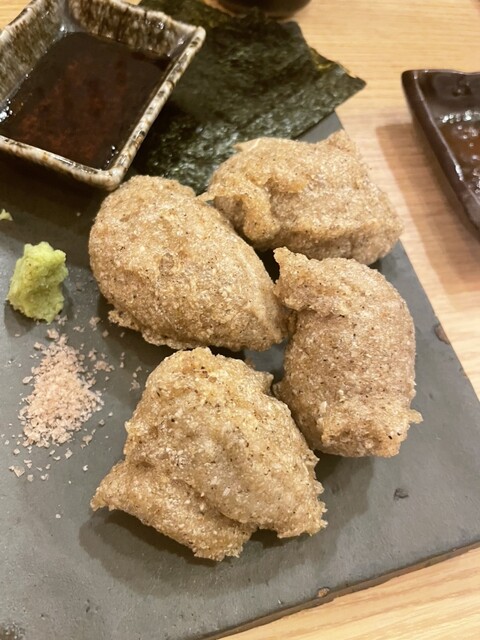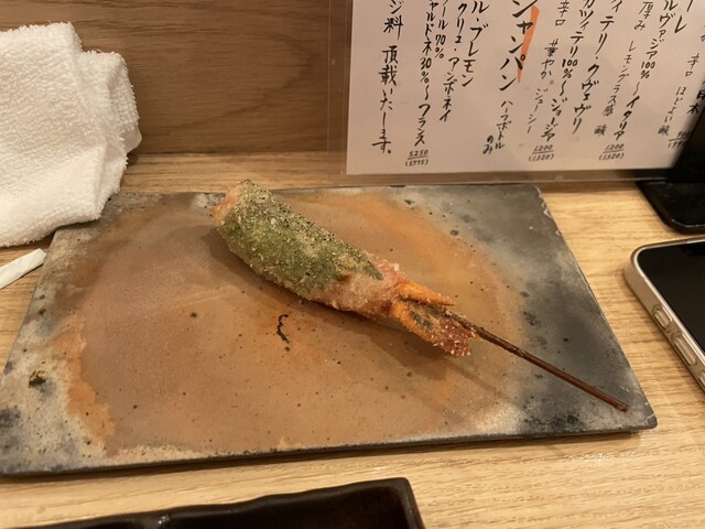 これ4620円コース。8本串がついてこの値段はリーズナブル。写真のそばがきの唐揚げだけはコースと別。でも初めて食べたが、確かにそばだ。