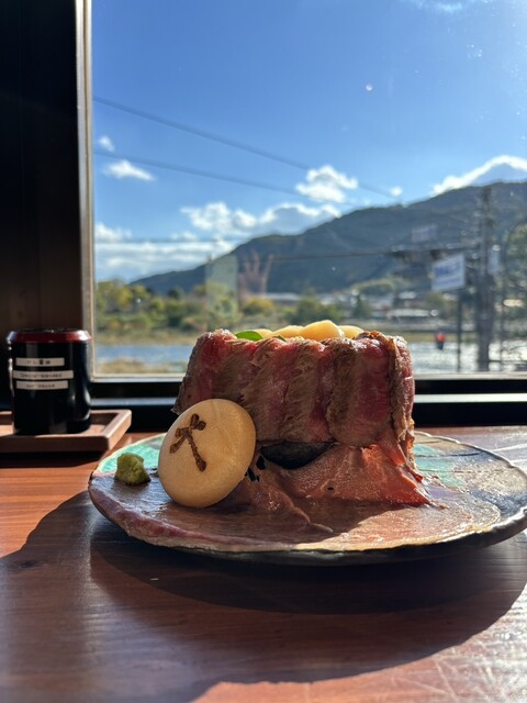 カウンター席から見える桂川や観光客が行き交う姿を見ながら。