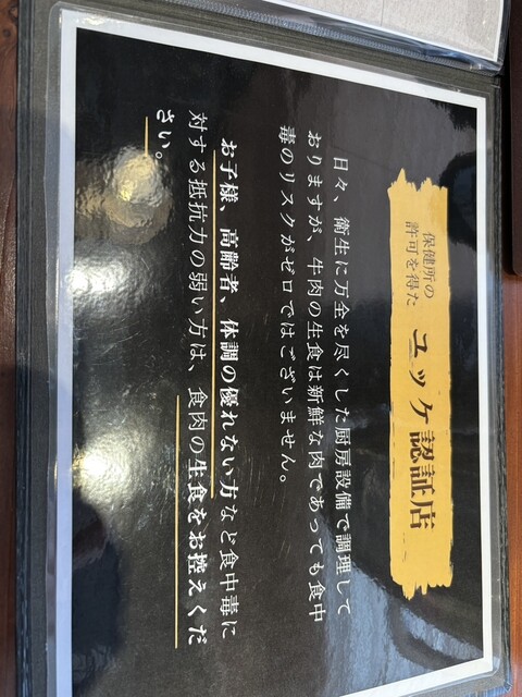 こちらのお店は保健所の許可を得た「ユッケ認証店」だそうで、ユッケも外せないよね!