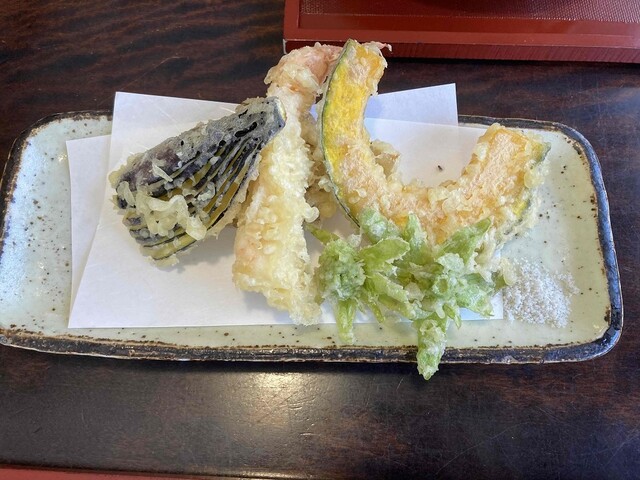 10割そば、天ぷら5品とメニューにはないお勧めのワカサギの磯部揚げを注文。