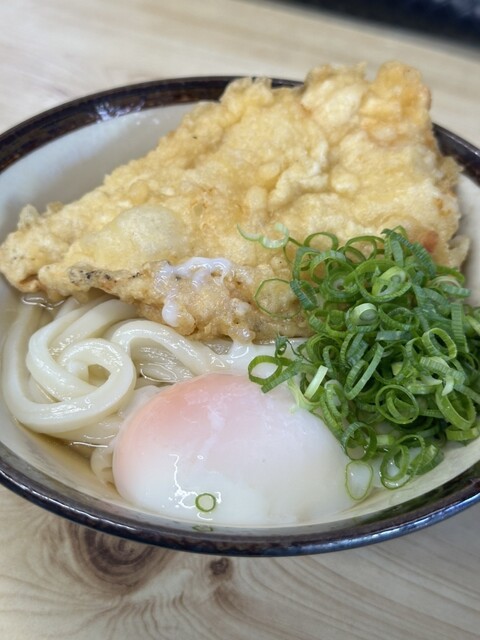 ひやあつのかけうどんと、とり天、温泉たまごをいただきました。
