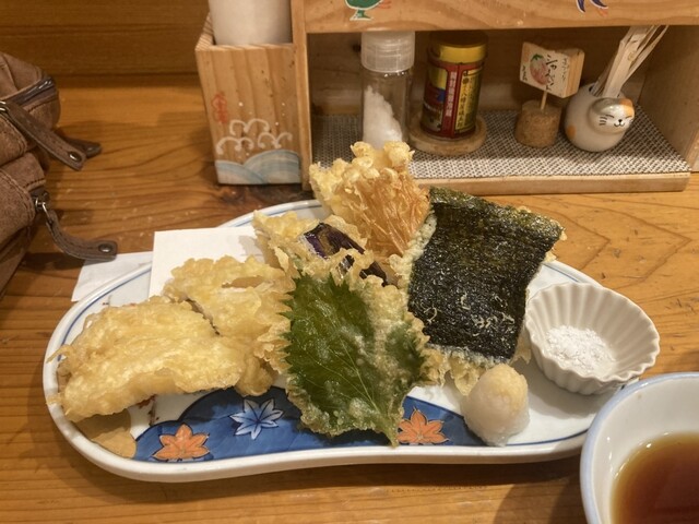 穴子のみボヨヨーンと来るかと思いきやこれは天ぷら盛り合わせではないですか。大葉、海苔、茄子にエノキが付いてます。肝心の穴子はフワッフワ、肉厚で旨み満点、淡白なので塩で食べると旨みが引き立ちますね。