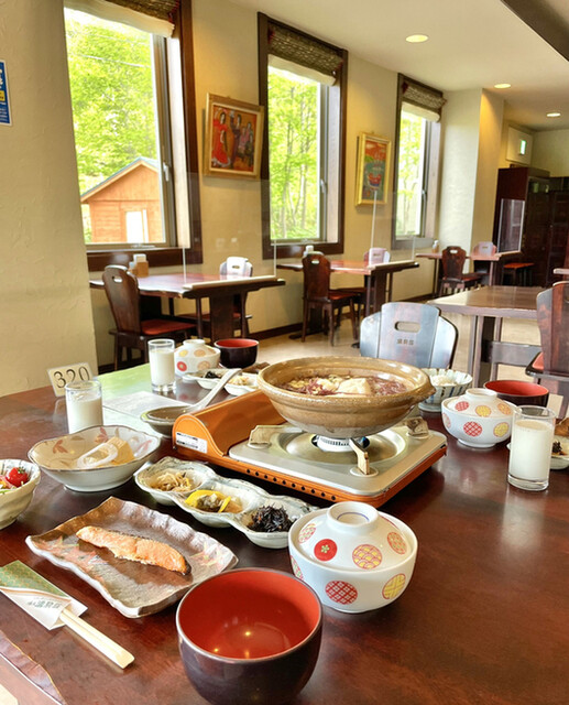 朝ごはんは燦々と陽の光を浴びて。外は雪景色〜( ^ω^ )