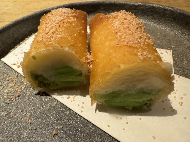 こちらも正式なメニュー名が思い出せないのですが、湯葉に包まれた煮穴子で、初めていただく食感でした。穴子は大好きですが、今回いただいた穴子は別格のおいしさでした。