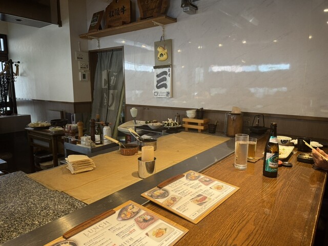 外からは中が見えず、中に入ると上品な和風の佇まいで、L字のカウンター席とテーブルがあります。