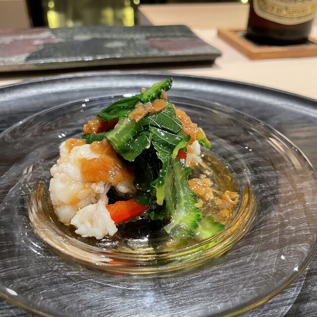 ハモ、ごうや、モロヘイヤの梅肉和え