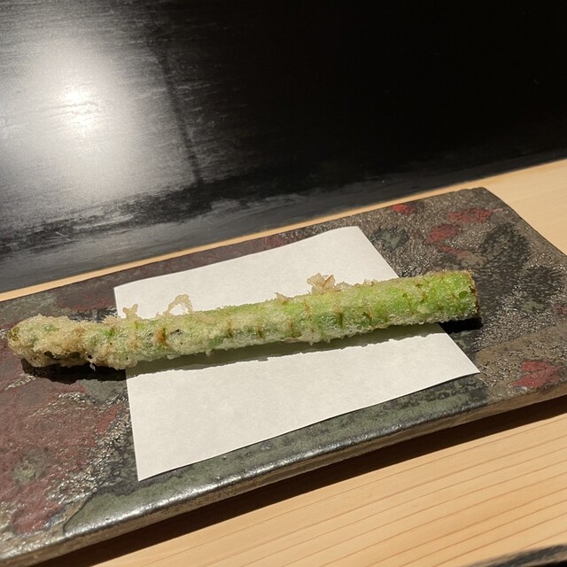 天ぷら一品目は定番の太刀魚。身厚でふっくらとふんわりした味わいでいつもながら美味しい。