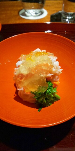 高知のアワビと大分の車エビ、レモンのジュレ。
