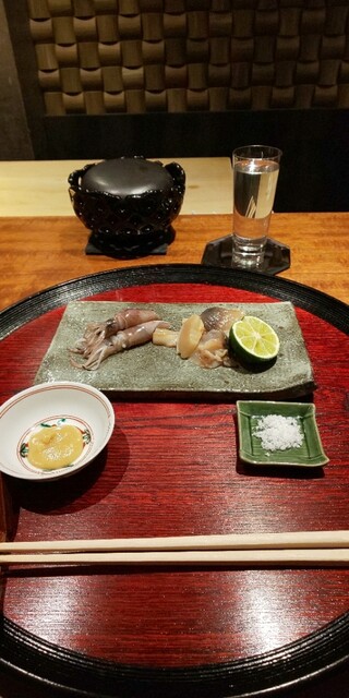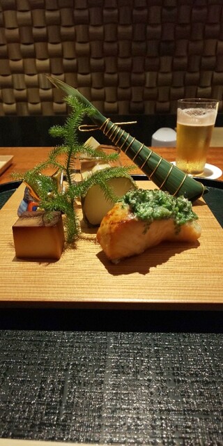 八寸。本物の貝に絵付けした綺麗な器。一晩炊いた淡路の鮑を蕗の薹の味噌で。奄美の車海老。貝柱と京都の九条ねぎ酢味噌。いつものチーズの燻製。