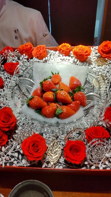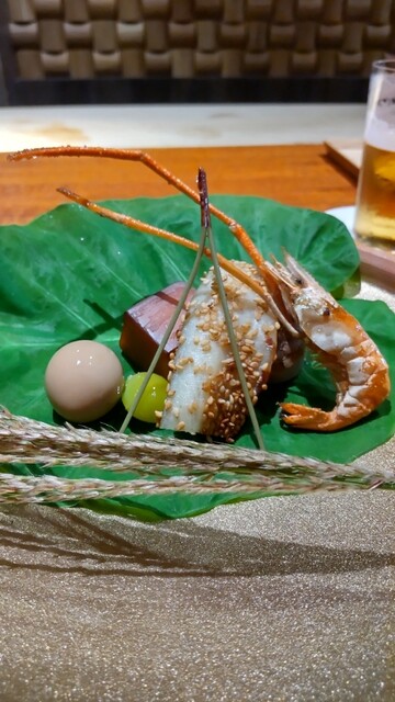 白甘鯛のお造り。大分の天然車海老。めっちゃでかい。一瞬酢じめ。松茸を白甘鯛で包んで頂く。