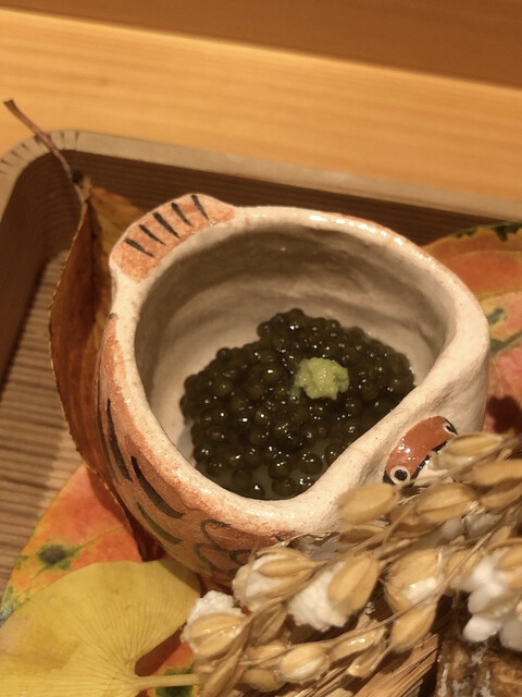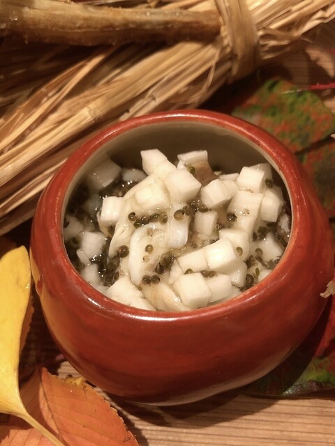 香箱蟹はぎっしりつまった身の上に内子と外子をたっぷり乗せその上に出汁の利いた餡をかけています。内子の半生感が素晴らしくまつ山さんでしか味わえない逸品です。