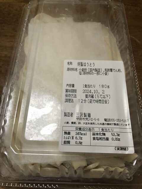 甲府に来たら、こちらに寄ります。とても美味しい製麺です。小麦粉、蕎麦粉から違うようです。また、たまらなく食べたくなる感じです。今日はラーメンのちぢれ太麺、蕎麦と餃子の皮をチョイスしました。アイスボックス持参です。