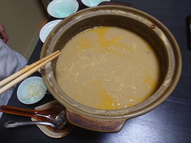 大根を食べ終わると、毛蟹の甲羅に残っていた蟹味噌を全て鍋で溶かせて、味噌ラーメンを作ってくれます。