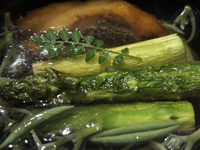 四品目は「旬のおこぜ、じゅんさい、アスパラのお吸い物」。おこぜの出汁がたっぷりとでており、おこぜの白身も何とも言えない美味しさで旨みがある。じゅんさいのとろみはどこか懐かしい味。太いアスパラは食感しっかり、でもしっかりと甘みを感じる。