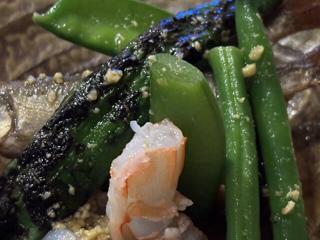 一品目は「季節の野菜と稚鮎のサラダ仕立て」。稚鮎は大人の苦味を少し感じる。エビの食感も心地よく、いいアクセント。いんげん、サヤエンドウ、なす、まさに季節感たっぷりの美味しいメンバー。